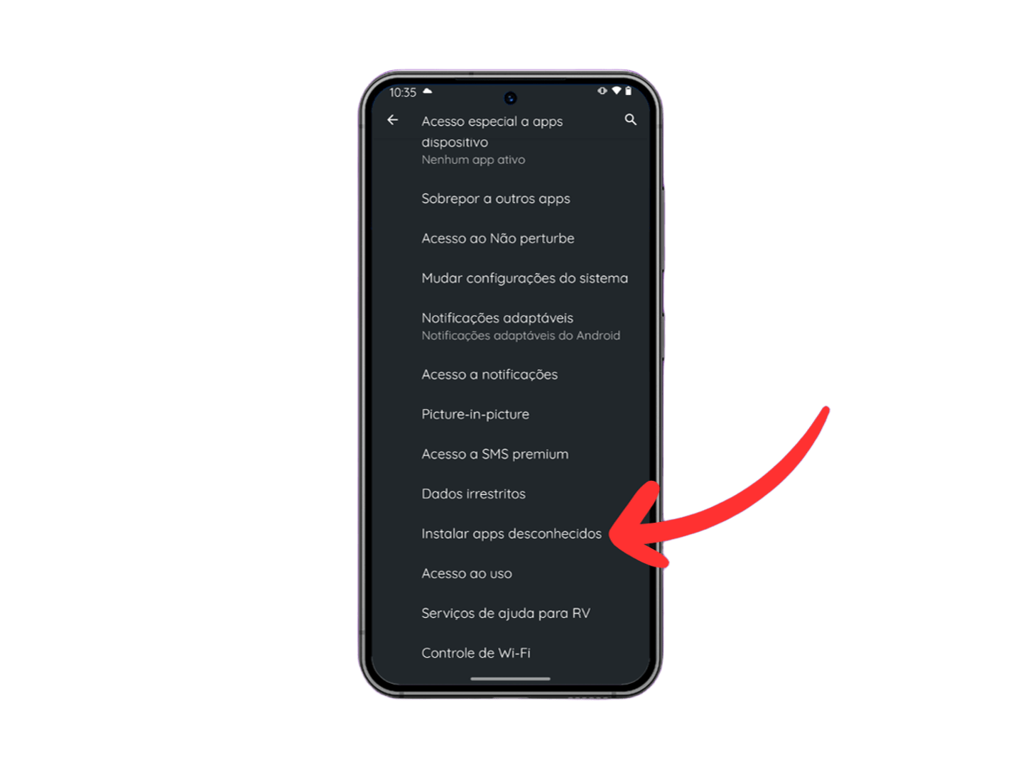 Escolha Instalar apps desconhecidos e selecione o app (navegador/gerenciador de arquivos).